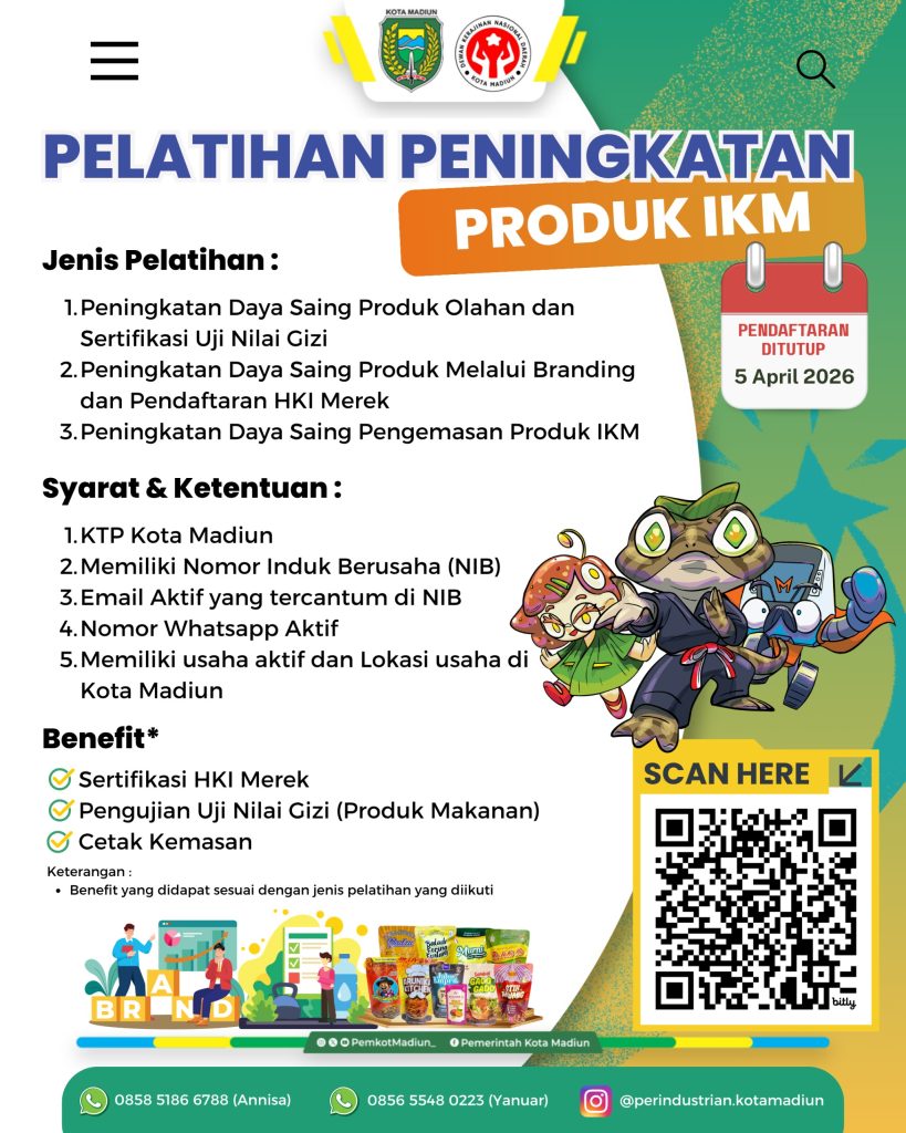 Pemerintah Kota Madiun kembali membuka pelatihan gratis khusus untuk warga Kota Madiun yang ingin mendaftarkan HKI Merek, Uji Nilai Gizi, hingga Cetak Kemasan.