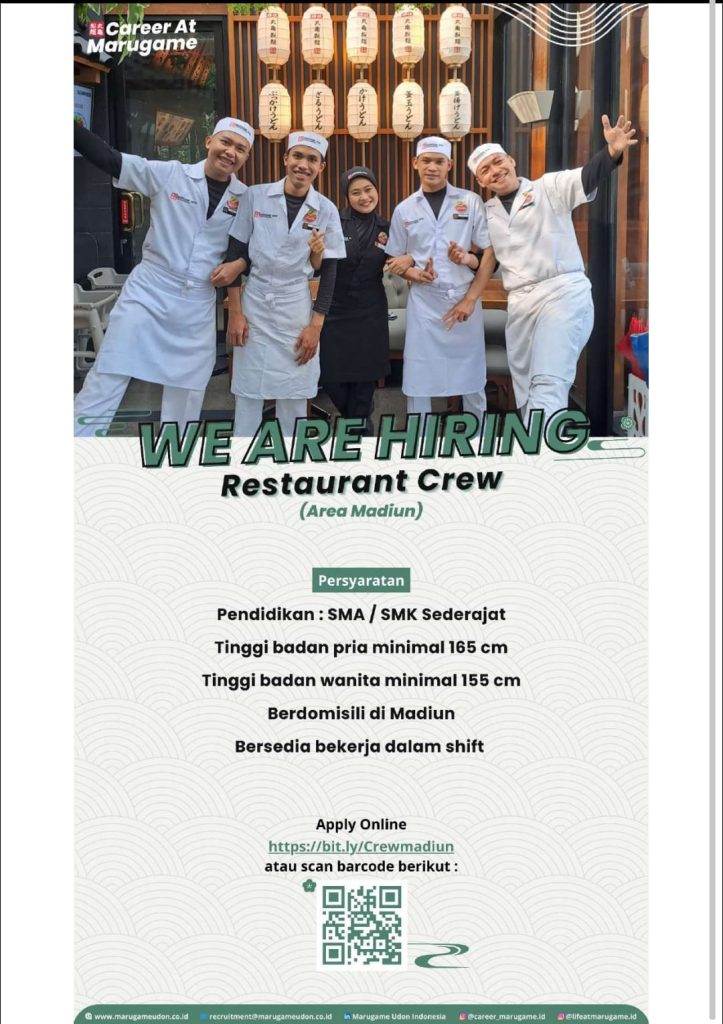 Pengumuman lowongan kerja untuk posisi Restaurant Crew di area Madiun, dari Marugame Udon. Berikut adalah informasi yang tertera