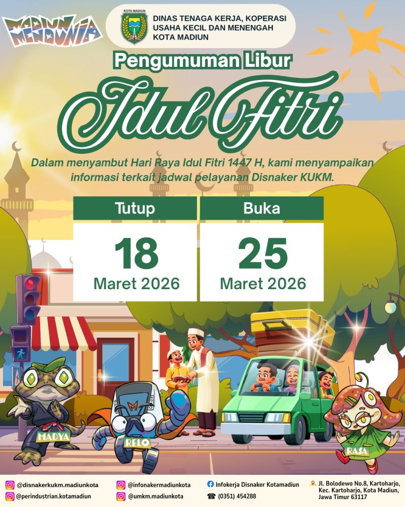 Dalam rangka menyambut Hari Raya Idul Fitri 1447 H, pelayanan Disnaker KUKM tutup mulai tanggal 18 Maret 2026 dan Kami akan kembali beroperasi normal pada tanggal 25 Maret 2026. Kami Segenap keluarga besar Disnaker KUKM mengucapkan Selamat Idul Fitri, Mohon Maaf Lahir dan Batin
